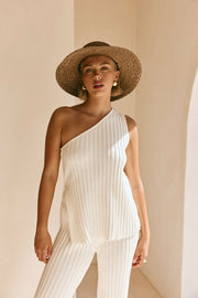 A spring staple set and super cute styling piece! The Audri Top is made from a high quality ribbed knit in white and features an asymmetric neckline. Get the set with the Audri Pants. Designed exclusively by Sabo.
