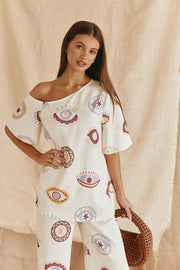 Perfect for mixing and matching, the relaxed Grace Top with our exclusive Matia print. It is a boxy style featuring an asymmetric neckline, short sleeves and boxy hem. Get the look with the Grace Pants or Marika Shorts. Designed exclusively by Sabo.