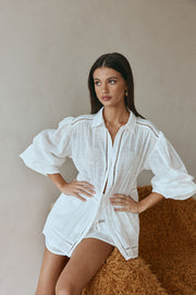 Perfect for summer, the Rita Top is made from a delicate natural cotton cheesecloth fabric in white. It is a boxy style featuring collar and functional button opening at centre front, bold puff sleeves, flouncy gathered detailing and sheer ladder trims throughout. Get the set with the Rita Shorts and style with the Zola Sandals. Designed exclusively by Sabo.