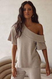 A classy set that can be dressed up with heels or kept casual with sandals! The Tarika Top is made from a comfy ribbed knit fabric in a stone hue. It is a relaxed style featuring an asymmetrical neckline with fold over panel detail and short boxy sleeves. Get the set with the Tarika Pants. Designed exclusively by Sabo.